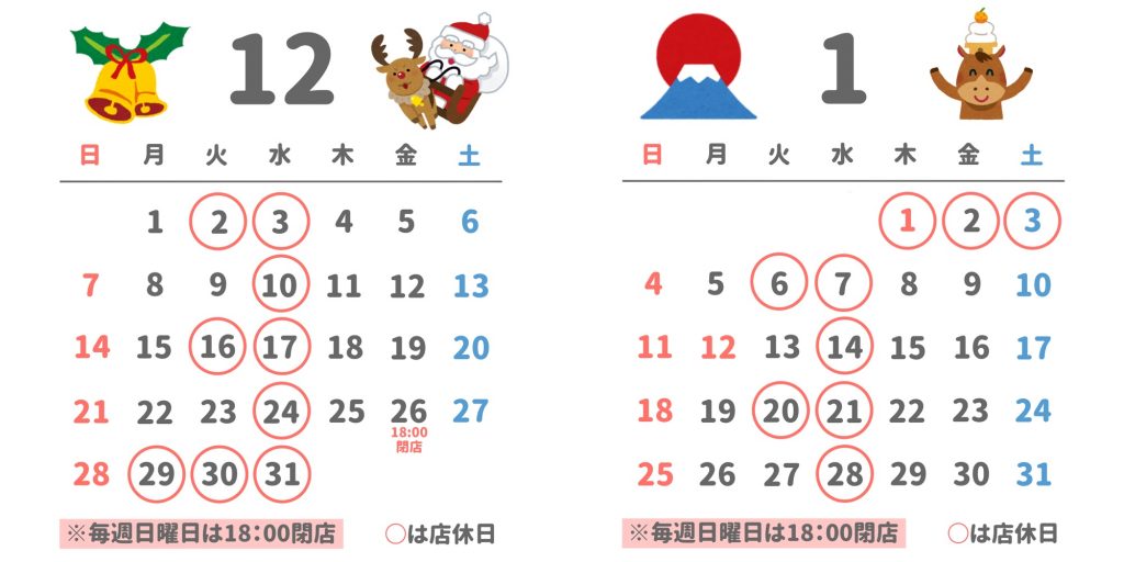 12月•1月店休日のお知らせ お知らせ 2025.12.03 12月・1月 店休日のお知らせ 12月は26日(金)を18:00閉店とさせていただきます。 また、12月29日(月)〜2026年1月3日(土)は冬季休業とさせていただきます。 お客様にはご不便をおかけいたしますがご理解のほどよろしくお願い申し上げます。 皆様のご来店を心よりお待ちしております。